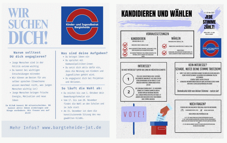 Du möchtest mitreden und deine Ideen einbringen?Dir sind deine Stadt und die Kinder- und Jugendlichen deiner Stadt wichtig? Dann bewirb dich als Kandidat oder Kandidatin für den nächsten KiJuB. Im November finden Neuwahlen statt. Bewerbungsunterlagen erhälst du hier: Kandidat*innenblatt_2025. Weitere…